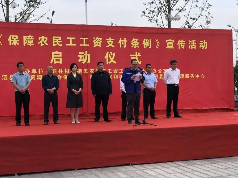 5月20日上午,泗县人力资源和社会保障局在县中央公园广场举办《保障农民工工资支付条例》宣传活动启动仪式。县人大、政府、政协及宿州市劳动监察支队相关领导、全县城区所有建设单位和48个在建总包单位参加。中国五冶集团代表总包单位在仪式上发言。