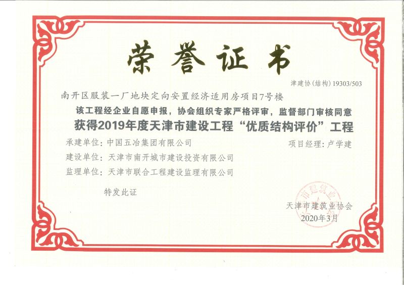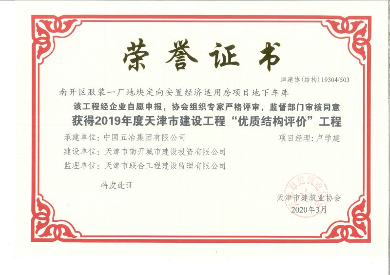 近日, 天津市南开区服装一厂地块定向安置经济适用房项目1号楼、7号楼、地下车库获得“2019年度天津市建设工程优质结构评价工程”。