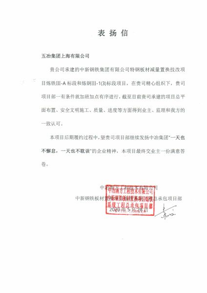 信中指出,我公司承建的中新钢铁集团有限公司特钢板材减量置换技改项目炼铁Ⅲ-A标段和炼钢Ⅲ-1(3)标段项目,自进场以来,精心组织,一有条件就组织工人加班加点、抢抓工期,保证项目建设有序推进。同时,信中还对项目总平面布置、安全文明施工、质量、进度等方面给予了充分认可。
