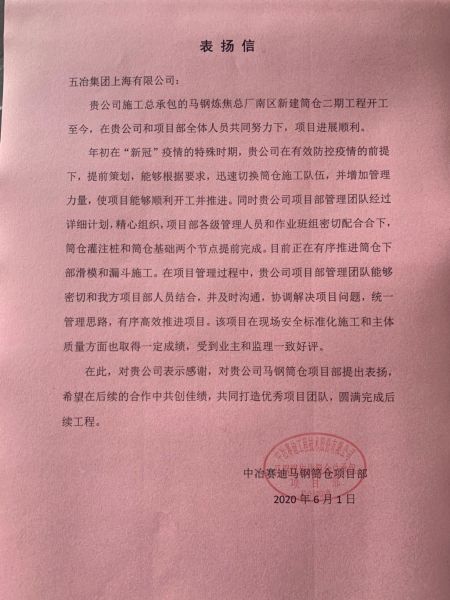 信中指出,马钢炼焦总厂南区新建筒仓二期工程开工至今,在我公司和项目部全体人员共同努力下,进展顺利。年初在“新冠”疫情的特殊时期,我公司在有效防控疫情的前提下,提前策划,根据甲方要求,迅速切换筒仓施工队伍,并增加管理力量,使项目顺利开工并推进。同时我公司项目部管理团队经过详细计划,精心组织,在各级管理人员和作业班组密切配合合下,提前完成筒仓灌注桩和筒仓基础两个节点。在项目管理过程中,我公司项目部管理团队和甲方项目部人员密切配合,及时沟通,协调解决项目问题,统一管理思路,有序高效推进项目建设。该项目现场安全标准化施工和主体质量方面,受到了业主和监理一致好评。