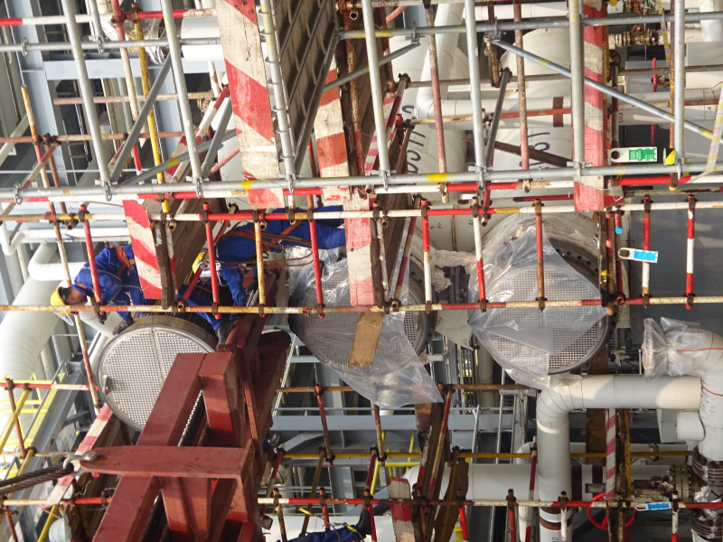 此次万华大修第一阶段涉及两个重点装置、160多台设备、50余项专项技改,其中主控项目26项,包括大型换热器吊装,换热器抽芯、塔器检修等作业内容。面对工期紧、任务重、质量高等诸多挑战,作业部迅速制定详细施工计划,在保证安全、质量的前提下,不断调整人员部署,增进每项工作之间紧凑度,提高工作效率。