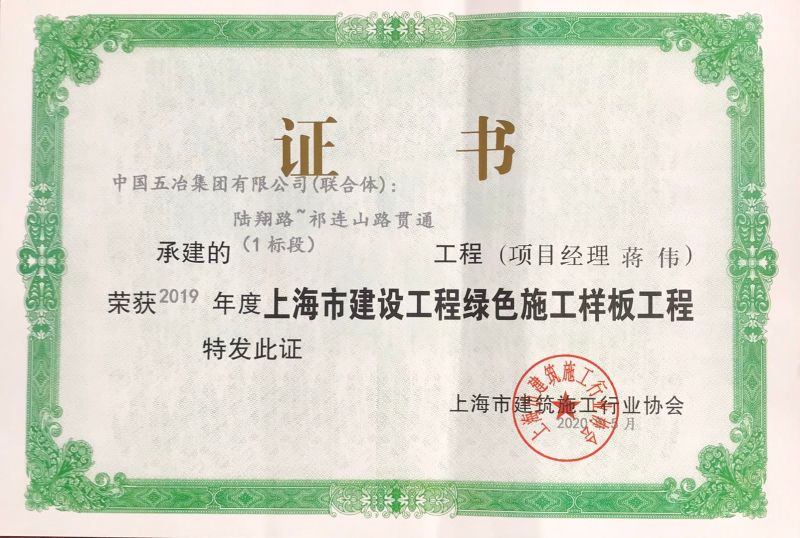 2020年6月,交通市政公司陆翔路项目收到了上海市建筑施工行业协会颁发的2019年度“上海市建设工程绿色施工样板工程”荣誉证书,此次获奖是陆翔路项目继2019年度“上海市绿色文明工地”后又一殊荣。