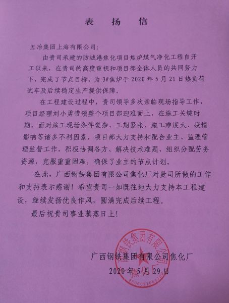 信中指出,我公司承建的防城港焦化项目焦炉煤气净化工程自开工以来,公司领导多次亲临现场指导工作,在施工关键时期,面对施工现场条件复杂、工期紧张、施工难度大、疫情影响等诸多不利因素,项目部经理刘小勇带领项目部全体职工迎难而上,支持和配合业主、监理管理监督工作,积极协调各方、解决技术难题、组织分配劳务资源,克服重重困难,确保了工程的节点计划。业主希望我公司一如既往支持项目建设,继续发扬优良作风,圆满完成后续工程。