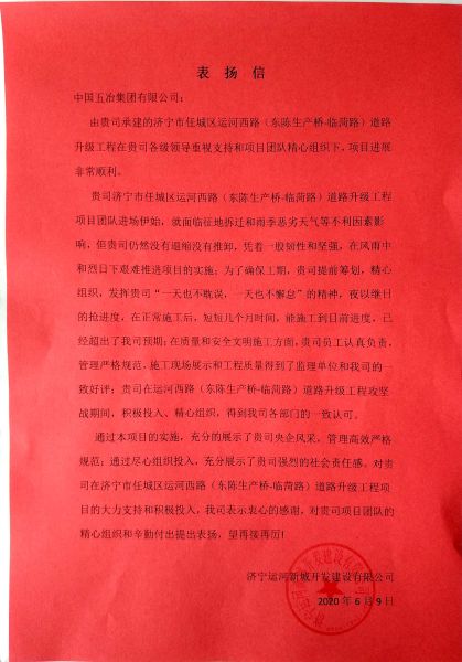 6月9日,济宁运河西路道路工程收到一封来自业主单位济宁运河新城开发建设有限公司的表扬信,信中业主单位对我项目部的工程进度、施工质量、安全文明施工成果都表示肯定。