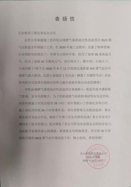 信中指出,在2020年施工过程中,我公司项目管理团队,克服了种种困难,经历了连续38度高温天气,经历了连续42天梅雨天气,实行两头干,歇中间,小雨大干,大雨间歇干,最终比原计划提前1天完成施工任务,确保新建5G/S煤气站顺利开通煤气并投入使用。在年修接口工作中,我公司施工班组两班倒24小时轮番作业,项目管理人员轮流值班,高压管控高空及动火作业,确保了年修工作安全顺利完成。