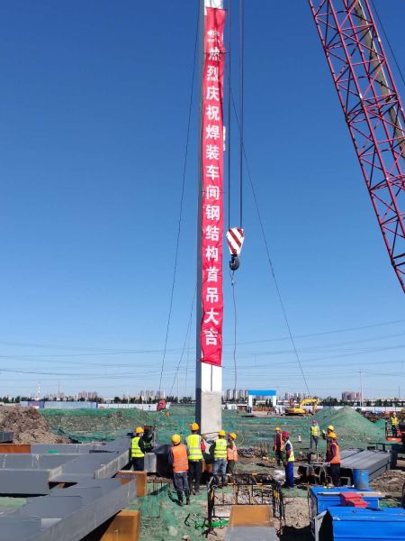 一汽丰田生态城新能源工厂项目系天津市2020年重点工程,一期占地面积97万平方米,建筑面积34.2万平方米,其中焊装车间总建筑面积约7.5万平方米,建筑高度17.2米,最大跨度32米,钢结构工程总量约8100吨。