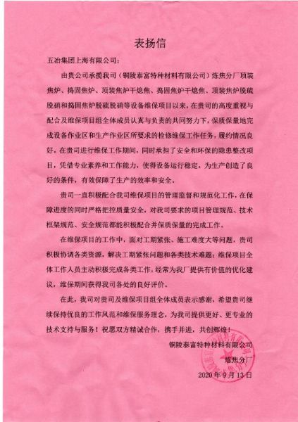 9月13日,中国五冶工程技术服务分公司第五分公司收到铜陵泰富特种材料有限公司炼焦分厂的表扬信,表扬第五分公司铜陵检修作业区为铜陵泰富特种材料有限公司炼焦分厂正常生产保驾护航做出的突出贡献。