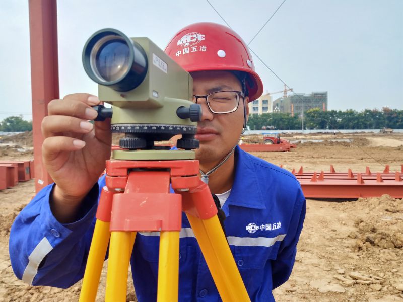 五河项目管理人员正在进行钢柱安装调平
