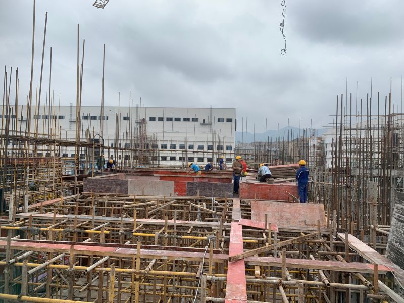 在横店影视产业园项目,“双节”期间施工现场一片热火朝天,近600人的施工队伍在现场紧张有序地忙碌着。目前,该项目东西区正处于装饰装修收尾阶段,中区正处于主体结构施工阶段,即将进行钢网架屋面吊装阶段。在中区施工现场,17#楼主体结构已完成,正在二次结构施工中,160余名施工作业人员正在进行主体结构的模板支设、钢筋绑扎工作,即将进行钢网架屋面吊装。16#、18#楼正在进行主体结构施工,木工、钢筋工配合作业,钢筋绑扎和模板施工穿插进行,同时室外工程施工也同步进行,10多名作业人员正在进行楼宇之间道路的碎石铺设。项目全体人员兢兢业业地坚守在工作岗位,全力争取10月底完成16#、18#楼主体结构封顶,决心以优异成绩献礼国庆。