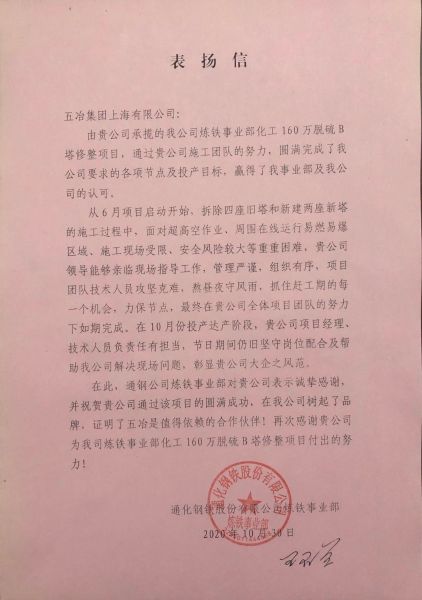 11月2日,工程技术服务公司第二分公司通钢作业部收到通化钢铁股份有限公司炼铁事业部的表扬信,对我公司承接的160万吨化产脱硫B塔修整项目的顺利完工给予充分肯定和衷心的感谢。