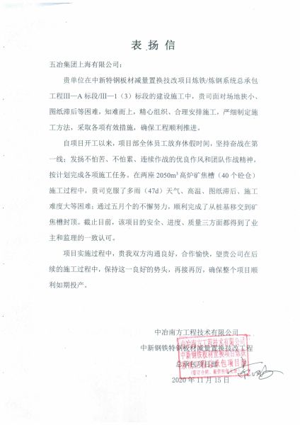 11月15日,工程总承包公司承建的中新特钢板材减量置换技改项目炼铁/炼钢系统总承包工程Ⅲ—A标段及Ⅲ—1(3)标段,收到了中冶南方工程技术有限公司中新钢铁特钢板材减量置换技改工程总承包项目部发来的表扬信。