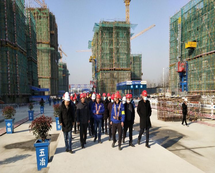 在项目施工现场,曹金伟一行首先听取了项目负责人关于施工安全、质量、进度方面的工作汇报,随后参观了项目VR展示厅及施工现场整体情况,对项目的整体规划、材料归置、现场绿化措施给予了充分肯定,同时也针对项目劳务劳资、大型机械机具管理等方面的经验与项目管理人员进行了深入交流。