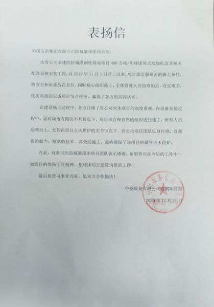 12月21日,广西钢铁集团有限公司烧结厂和中钢设备有限公司防钢项目部发来表扬信,对工程总承包公司承建的防城港钢铁基地项目400万吨/年球团带式焙烧机及其相关配套设施安装工程提出表扬。