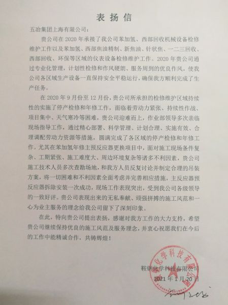 1月20日,工程技术服务公司第二分公司辽宁作业部收到鞍钢化学科技有限公司的表扬信,对我作业部在2020年设备常规履约及年大修工作中展现的无私奉献、顽强拼搏的施工风范和全心全意为业主的工作理念进行了通报表扬和衷心感谢。