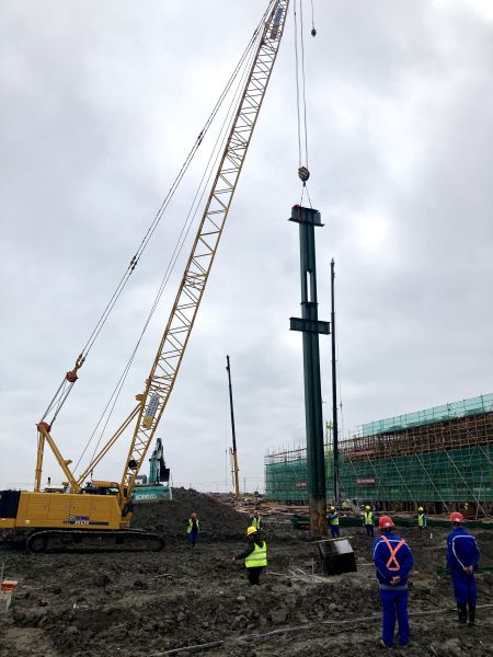 为确保本次吊装作业安全、顺利、高效的完成,项目部提前谋划吊装作业的施工部署和吊装计划,在风雨天气以及道路条件恶劣等情况下保住了铆焊车间首吊这一重要节点。项目管理团队也提前做好了充分的准备工作,吊装前组织所有施工人员进行详尽的安全技术交底,从现场安全、构件质量验收、起重机械设备等方面各司其职,并在吊装作业时全过程旁站,指导施工人员一次安装就位。本次吊装的铆焊及修理车间厂房钢柱长18m,重5.192t,采用55吨履带吊和一台曲臂车配合进行安装。随着铆焊及修理车间首节钢柱缓缓立起,精准就位,正式拉开铆焊车间钢结构安装的序幕。