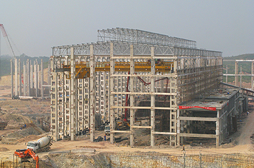 防城港市位于广西南部边陲,属南亚热带海洋性季风气候,多雨天气,年平均降雨量3465毫米,而且天气变化多端,特别上今年第8号台风“韦森特”带来的电闪雷鸣、狂风暴雨刚过,就出现了强烈紫外线下的高温酷暑。五冶金川项目部在如此恶劣的天气环境下,合理安排工期,有条不紊的组织施工,在短短5个月的时间内,就实现了熔炼主厂房安装量达12,000吨的结构制作与安装封顶,为机组设备的安装奠定了基础。目前,经过14个月的艰苦奋战,中国五冶负责承担的机组设备安装已完成50%,为确保2013年3月整个一期项目的投产奠定了坚实的基础。