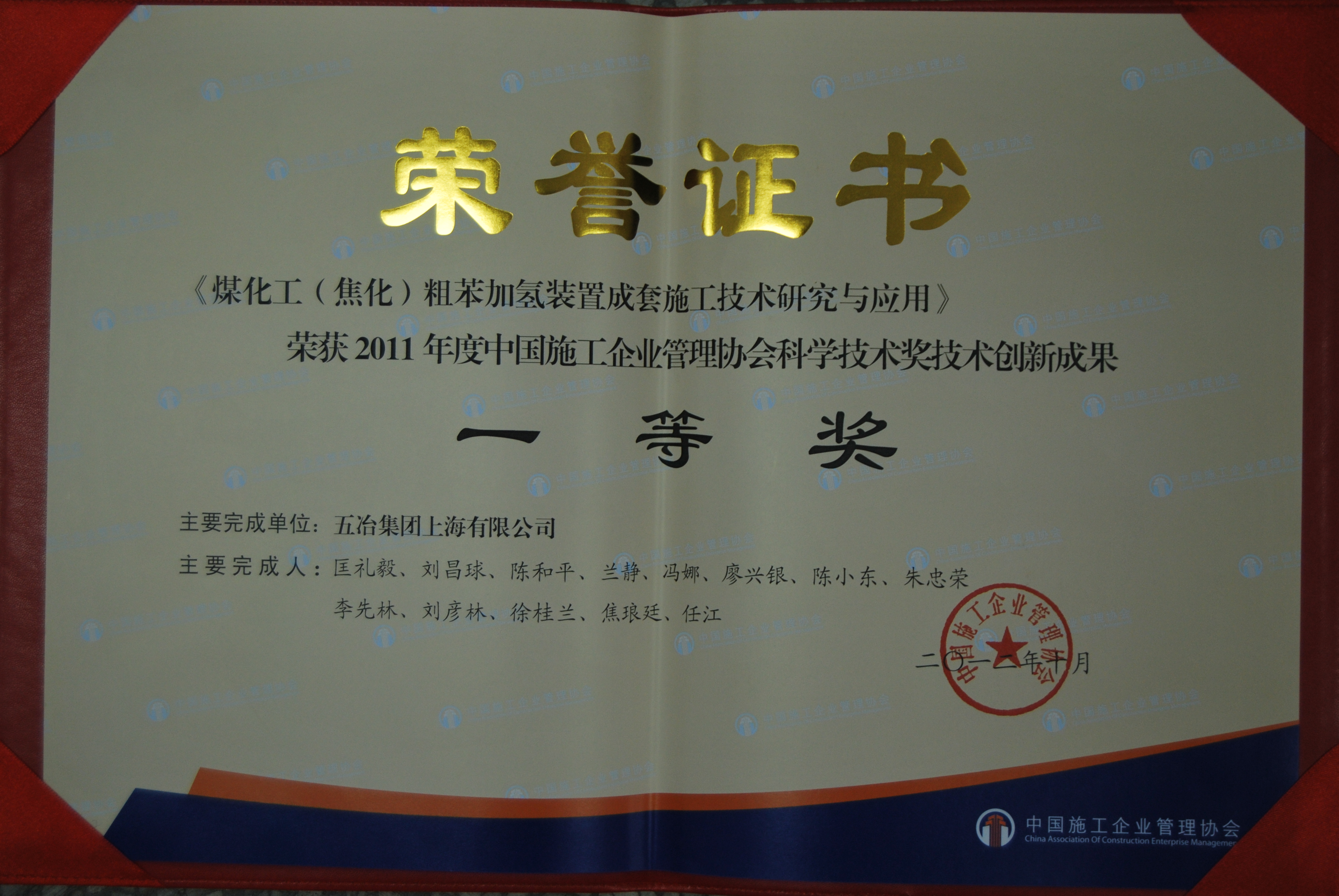 由五冶集团上海机电分公司完成的科技成果--煤化工(焦化)粗苯加氢装置成套施工技术研究与应用,获得了2011年度中国施工企业管理协会“科学技术奖”一等奖。本次共评出科技创新优秀成果421项(其中特等奖6项,一等奖155项,二等奖260项)。(冯娜)