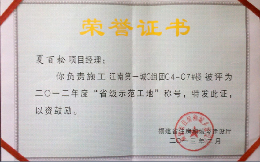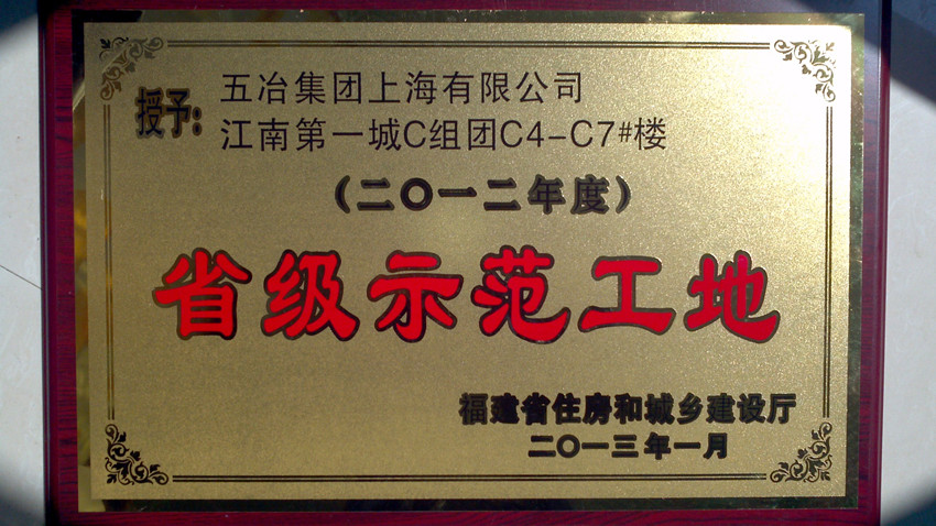日前,由五冶集团上海有限公司承建的南平江南第一城项目荣获福建省住房和城乡建设厅颁发的2012年度“省级示范工地”称号。 (万波)
