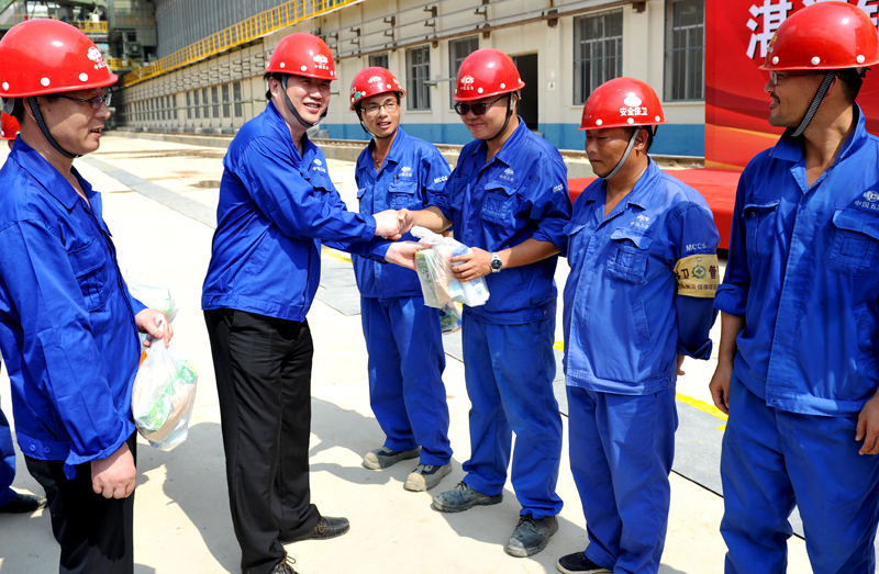 徐永锋一行为现场职工送去了防暑降温用品,并对现场职工提出了要求和希望:要求各单位认真做好防暑降温工作,各项防暑降温措施要落实到位,确保员工不发生中暑事故;希望全体员工在高温下作业要更多地注意安全,保护好自己,发扬“一天也不耽误、一天也不懈怠”的中冶精神,全力确保公司承建的宝钢湛江钢铁项目按期完成,实现五冶对宝钢的承诺。(马前刚/文 费虎/图)