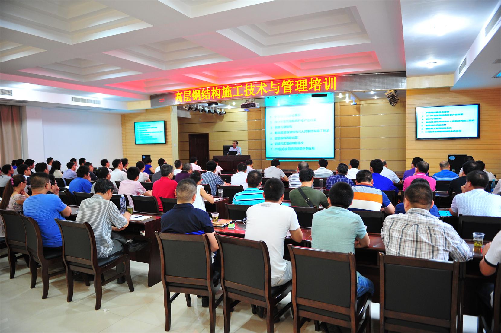 本次培训由中国钢结构协会副会长、中国钢结构协会专家委员会委员、上海金属结构行业协会专家委员会副主任委员、宝钢工程技术集团有限公司首席专家、总工程师贺明玄专家主讲。他从中国钢结构协会简介、2014年建筑钢结构行业产业政策、钢材与钢结构、高层建筑钢结构施工技术、建筑结构消能减震、钢结构工程强制性条文、BIM技术在钢结构制造中的应用七个方面进行了详细讲解,并展示了高层钢结构实际工程案例,理论与实践结合,图文并茂,形象直观,生动而有趣。