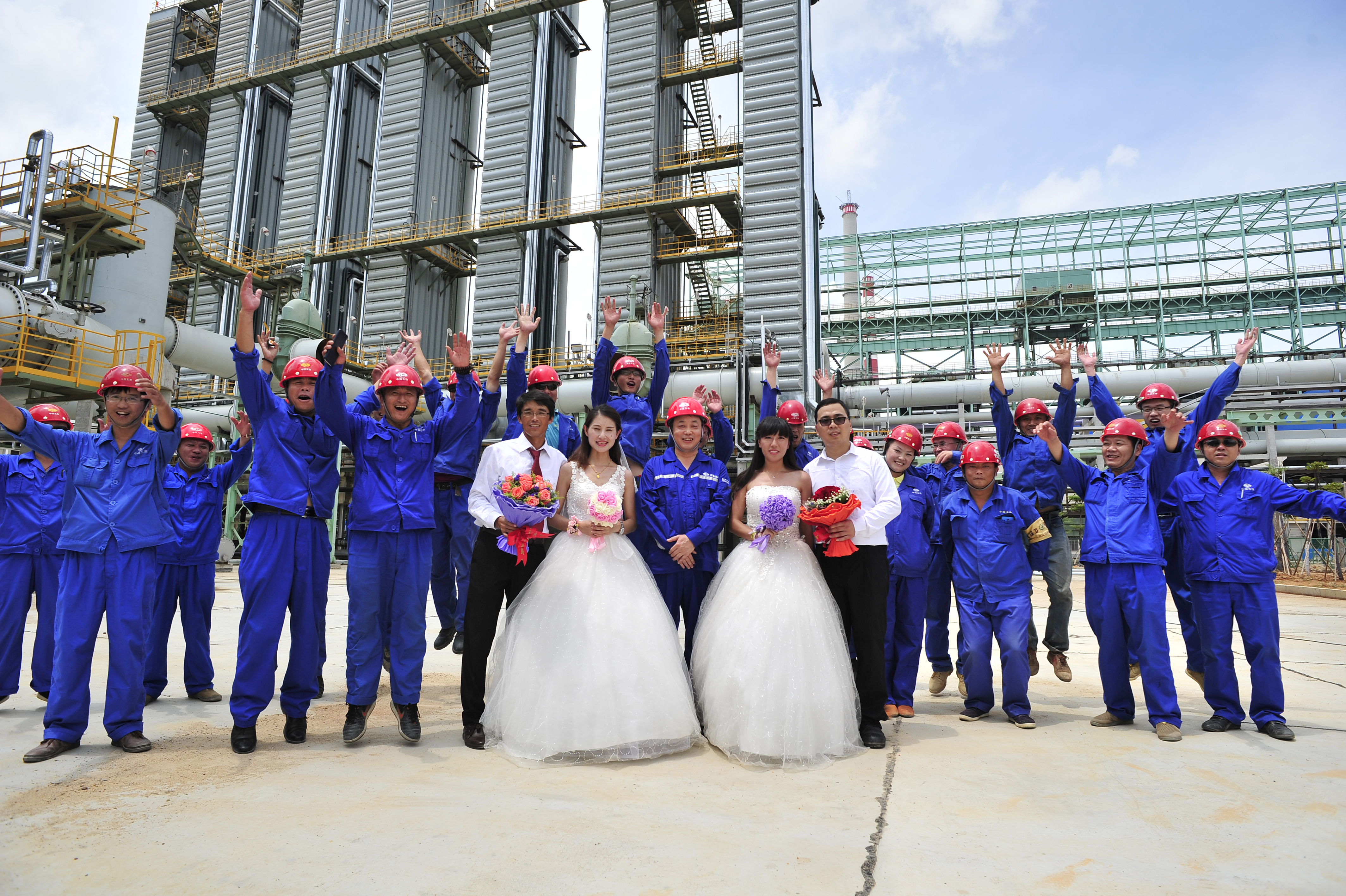 湛钢工地领导得知这一情况后,决定就在湛钢工地上为他们举行一次别样的婚礼。伴随着湛钢炼焦项目机器设备的轰鸣声,湛钢五冶分指挥部党工委书记薛志群向两位新人献上了鲜花,并送上了深深的祝福,薛书记说道:“你们为湛钢工地的建设做出了贡献,辛苦了。这次的婚礼有着特殊的意义,希望你们幸福美满,和和睦睦,白头到老。也希望你们能早生贵子,像咱们湛钢工地一样,早日结出丰硕的果实。”随后,在现场20多位工友的见证祝福下,两对新人相互拥吻。在大家的欢呼和祝福声中,新人流下了幸福和激动的泪水。