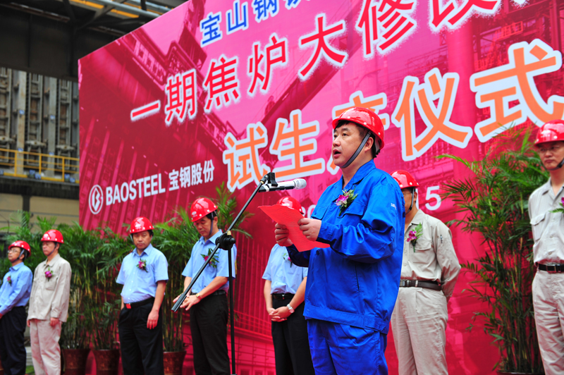 9月15日上午, 在宝钢焦二十路4#干熄焦处,彩旗招展,人声鼎沸。宝钢一期焦炉大修改造工程试生产仪式在此隆重举行。宝钢股份总经理戴志浩、副总经理智西巍,五冶集团上海有限公司总经理徐永锋、副总经理理汪忠旭及建设、设计、监理、施工方等单位代表约200人聚集一堂,共同见证了2A、2B炉同步出焦的历史性时刻。