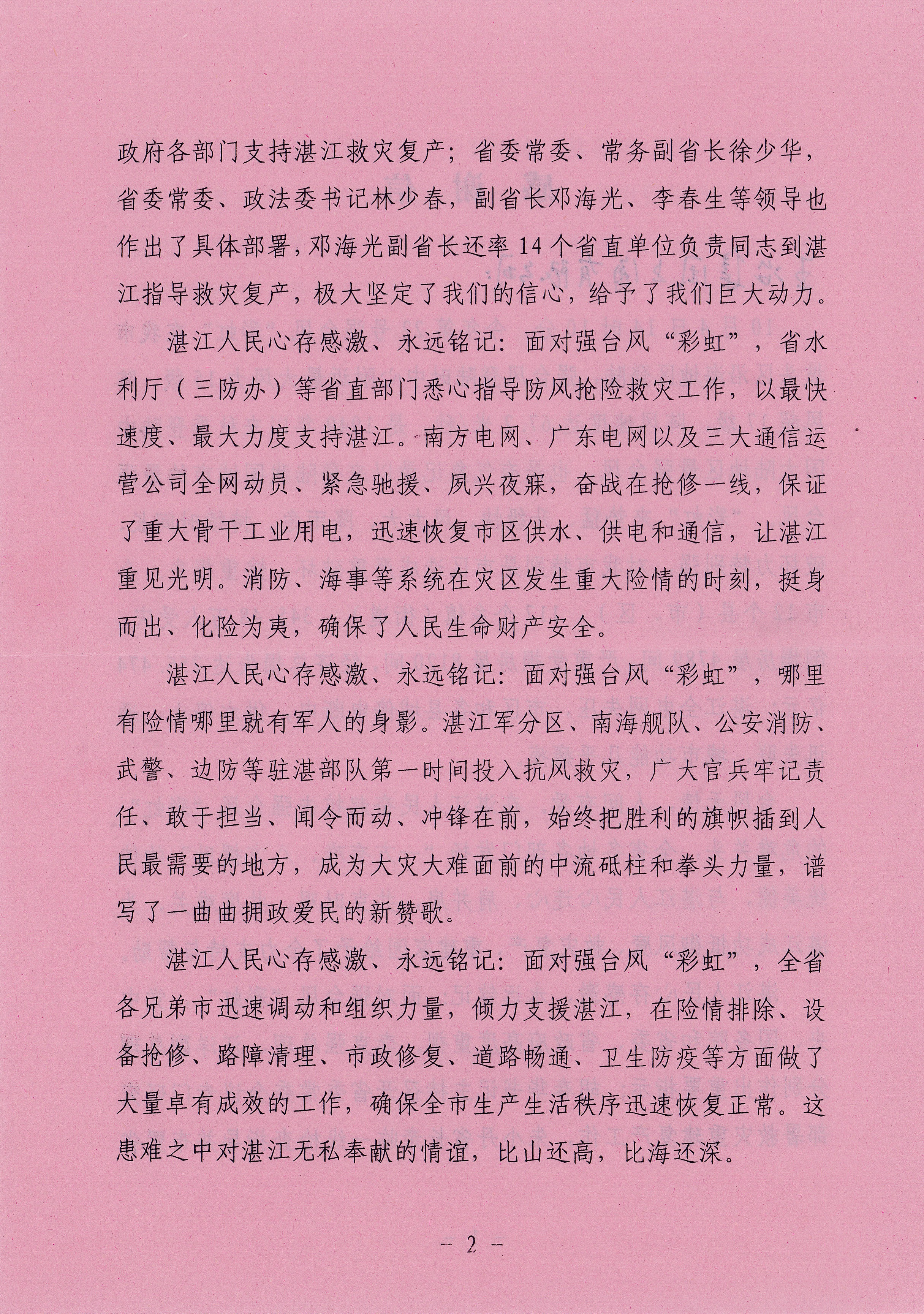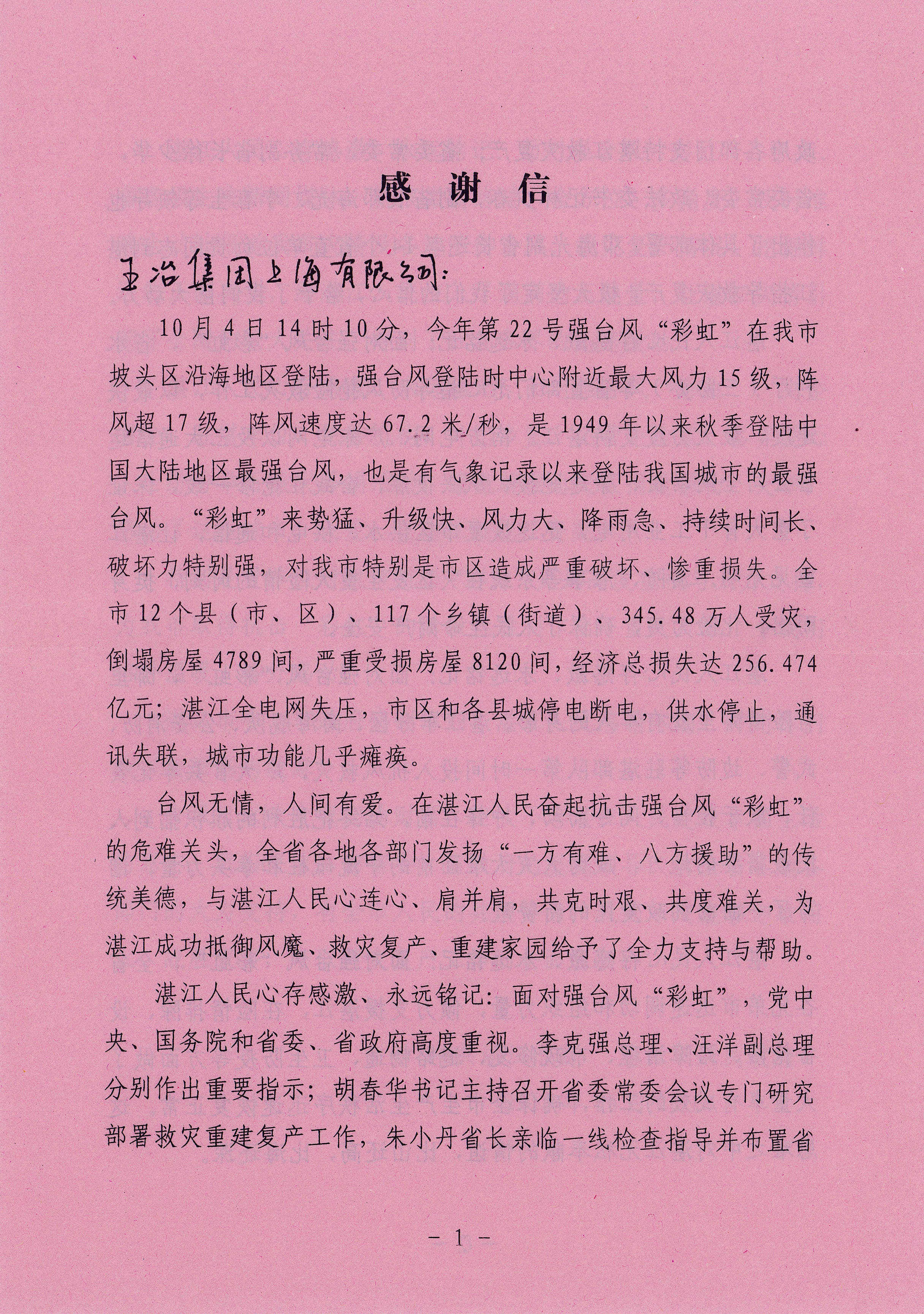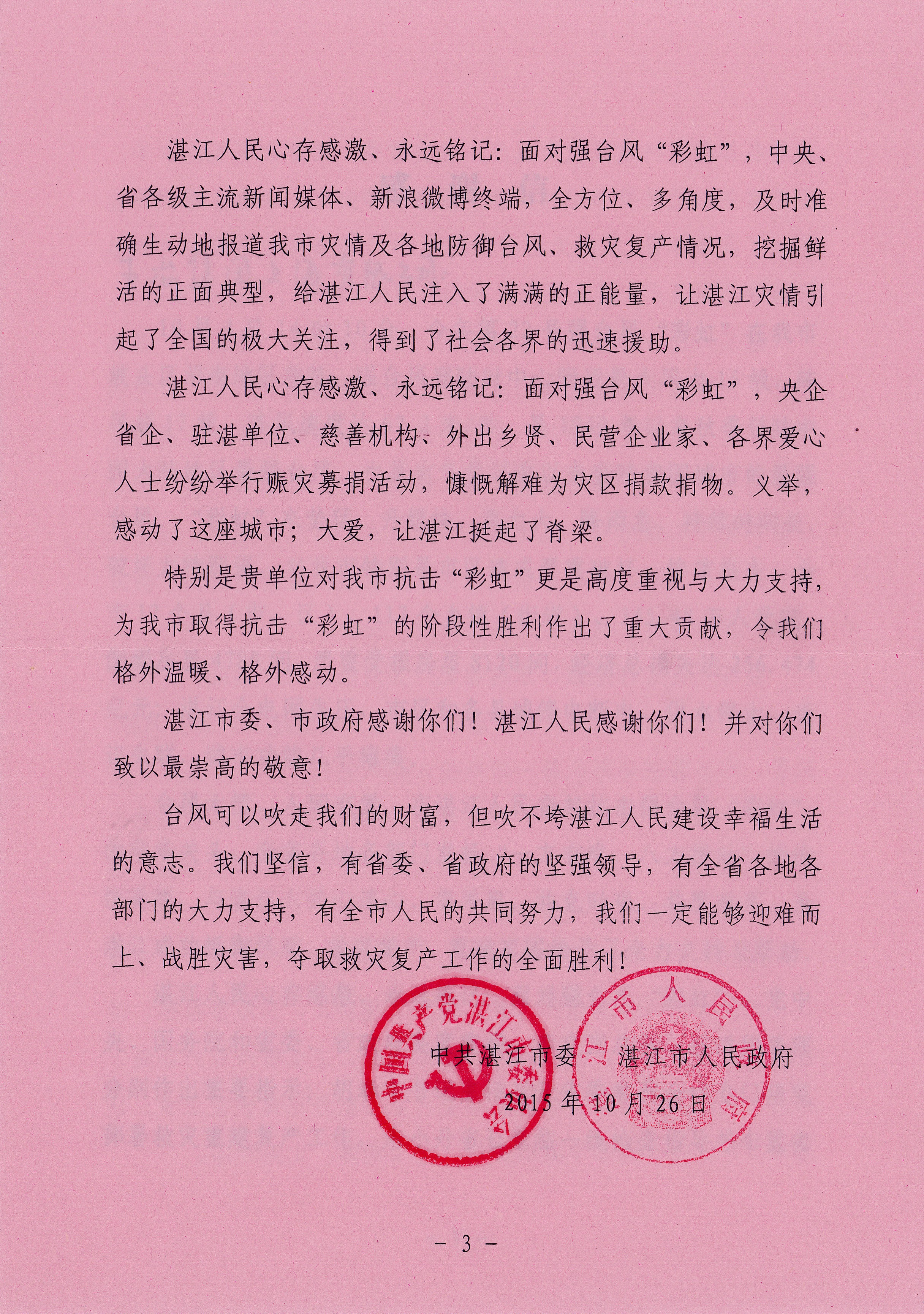 2015年11月9日获悉,湛江市委、市政府向五冶集团上海有限公司发来感谢信,感谢该公司在面对1949 年以来秋季登陆中国大陆地区最强台风,也是有气象记录以来登陆我国城市的最强台风——强台风“彩虹”时,发扬了”一方有难、八方援助”的传统美德,与湛江人民心连心、肩并肩,共克时艰、共渡难关,并迅速调动和组织力量倾力支援,在险情排除、设备抢修、路障清理、市政修复、道路畅通、卫生防疫等方面做了大量卓有成效的工作,确保全市生产生活秩序迅速恢复正常。