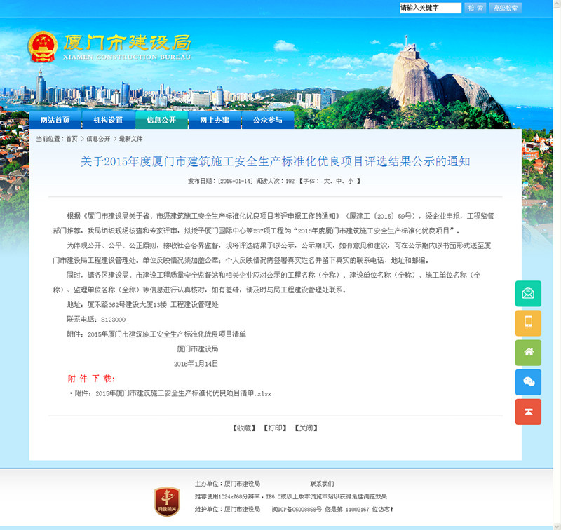 2016年1月14日,厦门市建设局网上发布《关于2015年度厦门市建筑施工安全生产标准化优良项目评选结果公示的通知》,中国五冶厦门国贸金融中心项目名列其中。