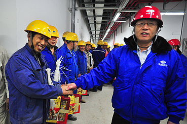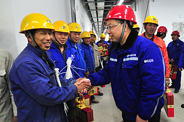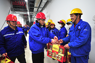 下午2时的宝之云IDC三期项目工地,70多名工人正在紧张地进行该项目的电气室电缆敷设的施工。倪治寿首先转达了程并强董事长、田舜总经理对加班员工的亲切问候和新春祝福,他说:为了做好该项目,大家放弃春节假日与家人团聚的机会,坚守在各自的工作岗位,在此,向大家表示衷心感谢!希望大家要在保重安全和施工质量的前提下,干好该项目,为机电分公司的转型发展做出贡献。