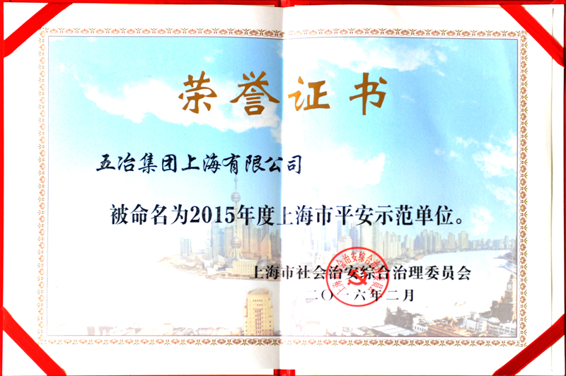 五冶集团上海有限公司荣获2015年度“上海市平安示范单位”称号