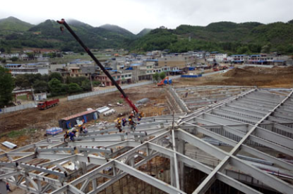 平塘星辰主题酒店钢结构裙楼,工人正在钢梁上焊接檩托板