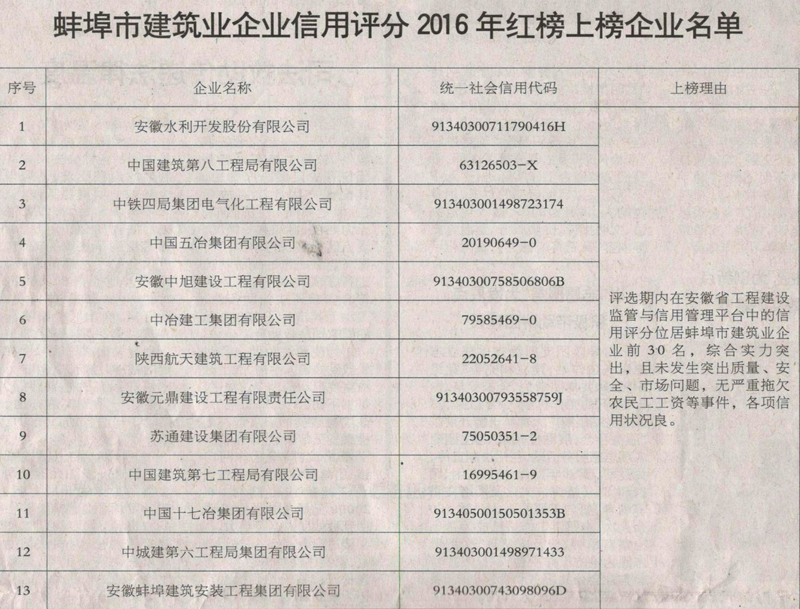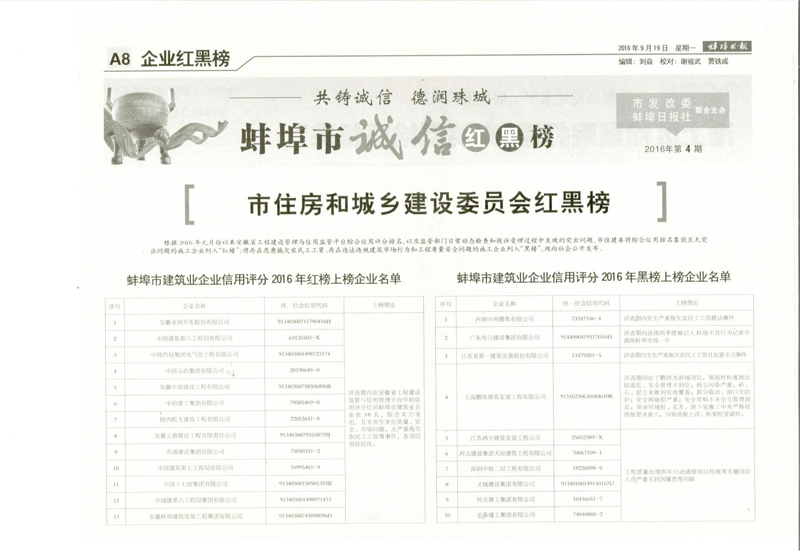 9月19日,在《蚌埠日报》刊发的《蚌埠市诚信红黑榜》上,中国五冶集团荣登“红榜”。其上榜理由:评选期内在安徽省工程建设监管与信用管理平台中的信用评分位居蚌埠市建筑业企业前30名,综合实力突出,且未发生突出质量、安全、市场问题,无严重拖欠农民工工资等事件,各项信用良好。