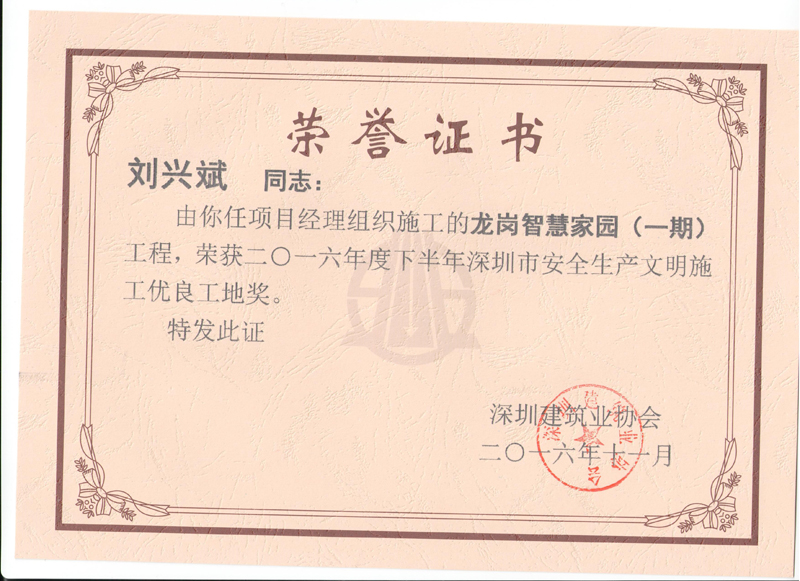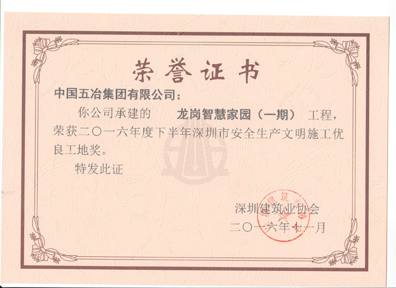 近日,由中国五冶集团承建的深圳龙岗智慧家园(一期)工程荣获“2016年度下半年深圳市安全生产文明施工优良工地奖”。