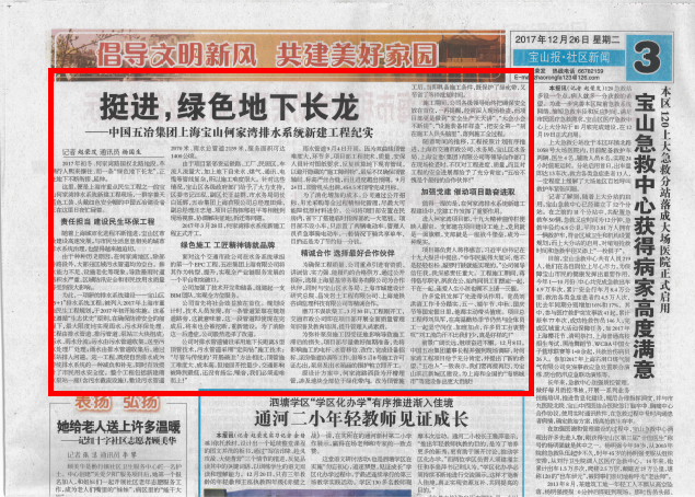近日,建筑时报、宝山报等媒体,在重要版面刊发了题为《挺进,绿色地下长龙》的通讯文章,集中报道了五冶集团上海交通市政分公司何家湾项目的建设情况,对中国五冶集团在民生工程建设过程中的好做法、好经验以及勇担央企责任的行为给予了充分肯定和高度评价。(程导)