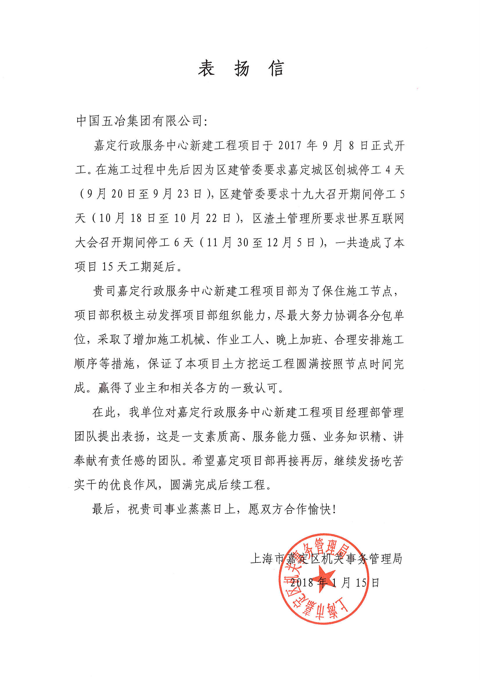 2018年01月15日,我司再次收到上海市嘉定区机关事务管理局对嘉定行政服务中心新建工程项目经理部的表扬信,对我司在嘉定行政服务中心新建工程项目中吃苦实干、讲奉献的精神,以及排除万难保住施工节点给予了高度肯定。
