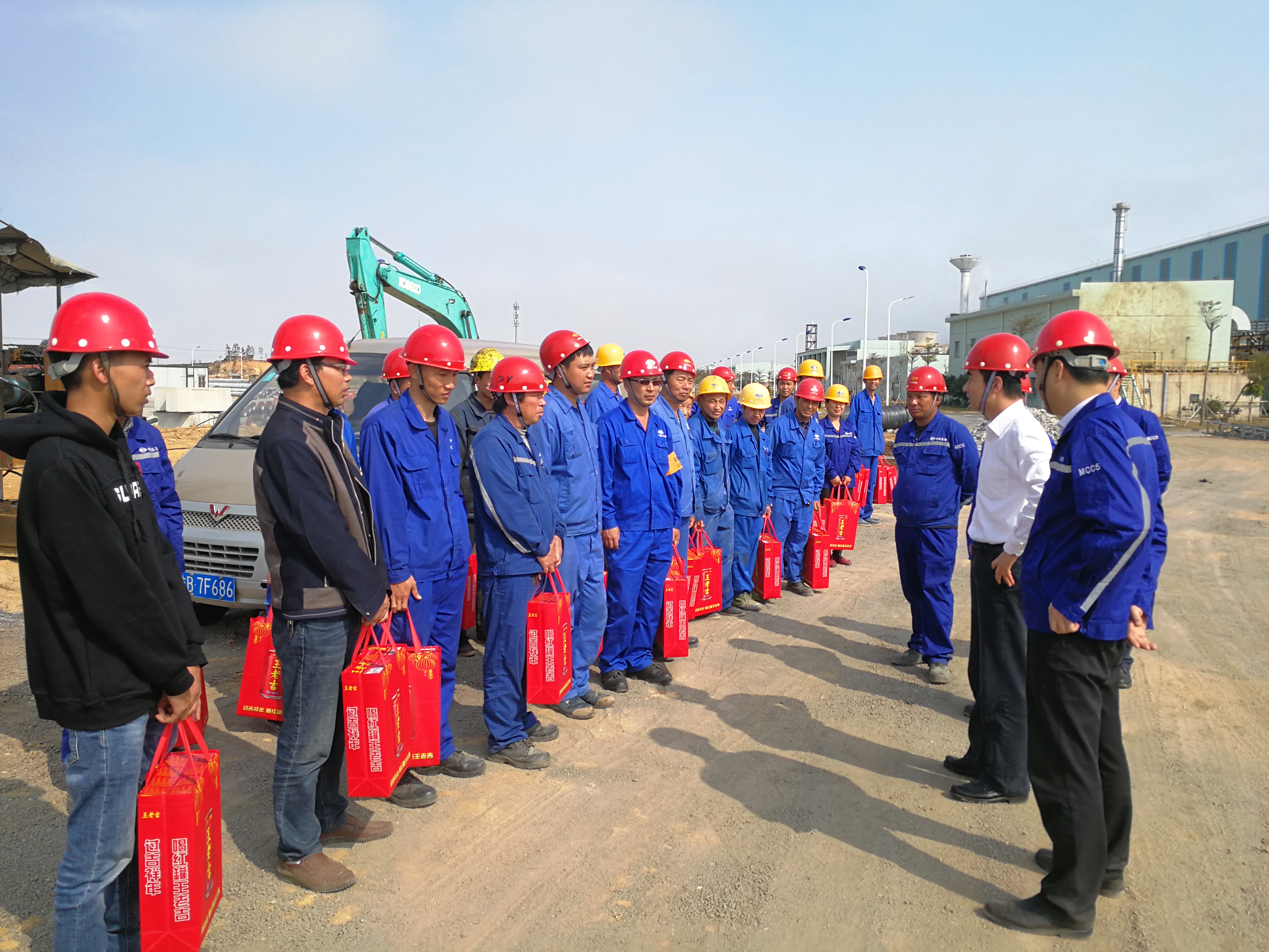 声声问候送真情,浓浓关怀暖人心。受中国五冶集团董事长、党委书记程并强的委托,2月20日(大年初五),五冶集团上海有限公司总经理田舜来到薄板事业部施工的宝钢湛江高强钢项目部,向春节期间坚守在一线的60余名员工送上慰问品和节日的问候。