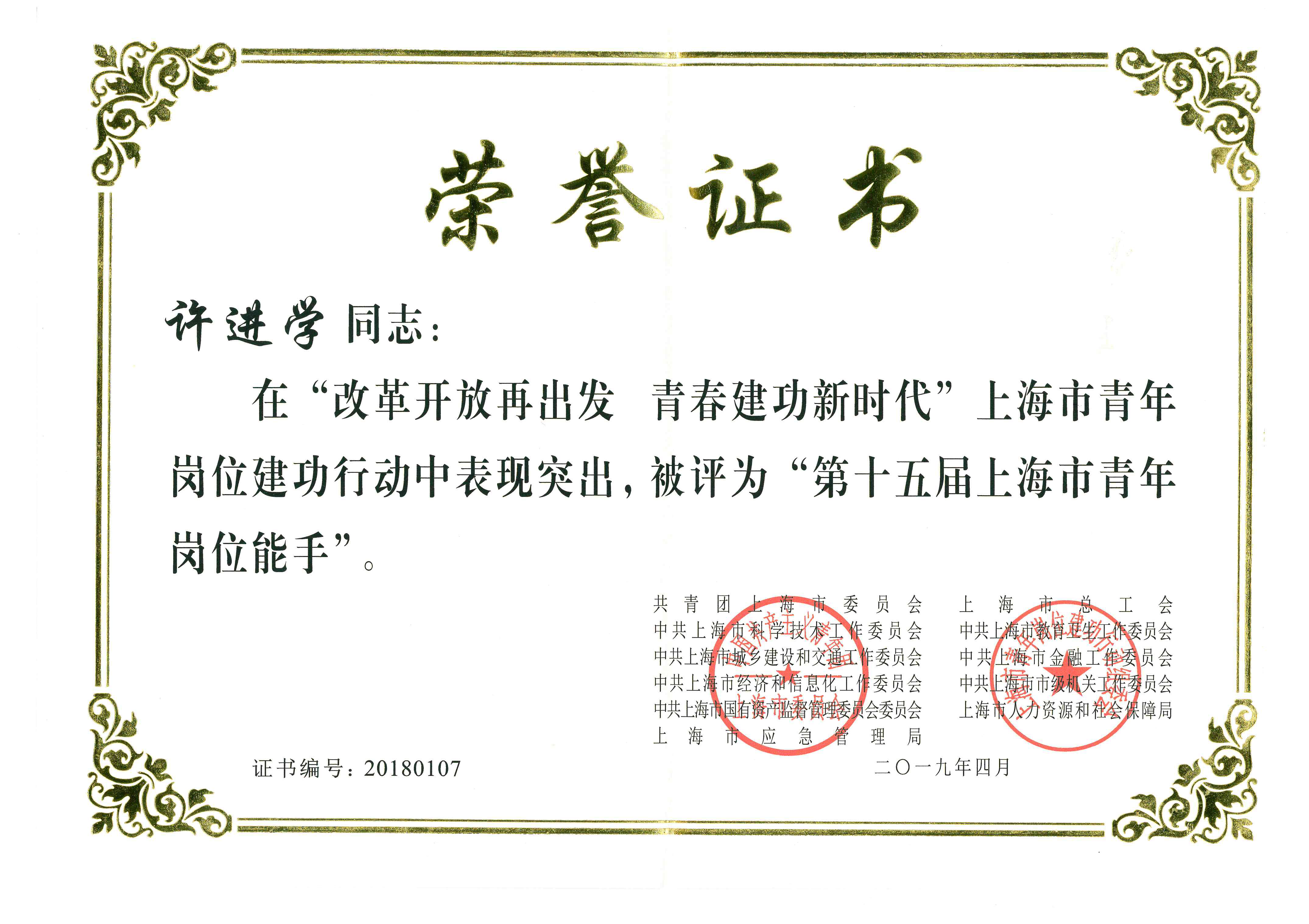 近日,五冶集团上海有限公司许进学同志荣获“第十五届上海市青年岗位能手”。为纪念五四运动100周年,该奖项由上海团市委、市总工会等上海市青年岗位建功行动组委会成员单位评选产生,旨在表彰在上海打造“四大品牌”和建设“五个中心”过程中,立足本职岗位、锐意进取、攻坚克难的各行业优秀青年。