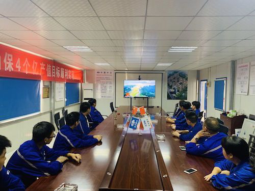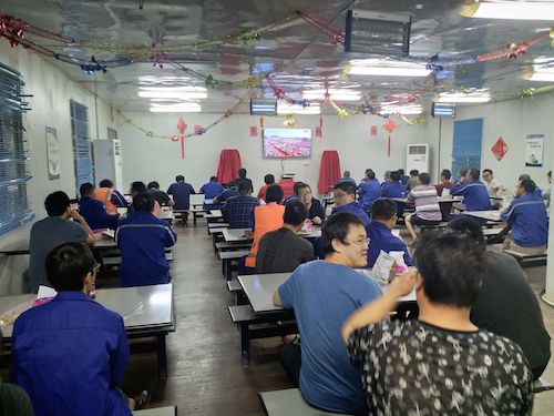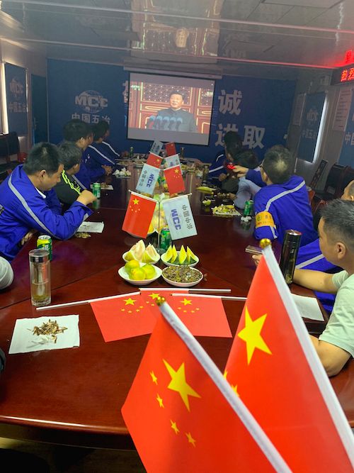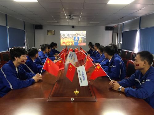 千里之外的沙特项目部,亦不忘感受这一壮美时刻。沙特时间2019年10月1号凌晨4:30时分,沙特项目部人员齐聚项目部食堂,坐在电视机前等待观看祖国70周年国庆阅兵式。