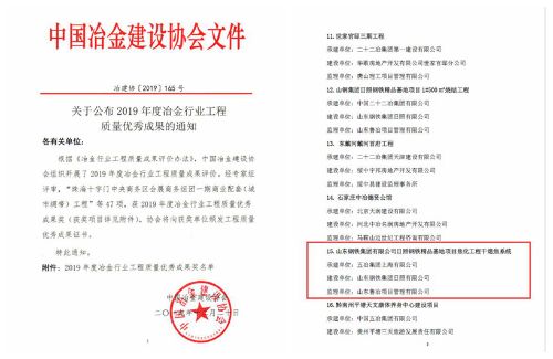 近日,经中国冶金建设协会专家组评审,工程总承包分公司承建的山东钢铁集团有限公司日照钢铁精品基地项目焦化工程干熄焦系统,荣获2019年度冶金行业工程质量优秀成果奖。
