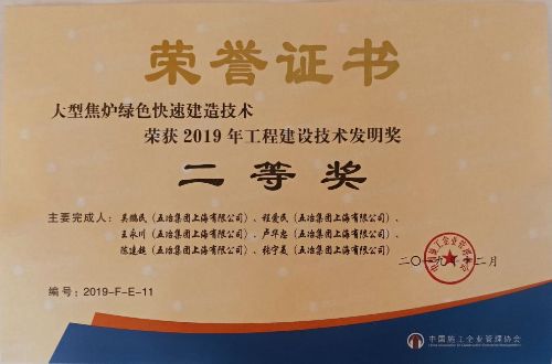2019年12月27日,中国施工企业管理协会在天津召开本年度工程建设科学技术奖励大会,由三公司完成的技术成果《大型焦炉绿色快速建造技术》荣获技术发明二等奖。据悉,本次工程建设科学技术奖共评出最高科学技术奖2项、技术发明奖13项、科学技术进步奖368项。