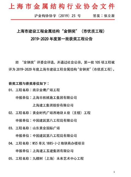 上海市建设工程金属结构“金钢奖”是1996年经上海市建筑业管理办公室批准设立,由上海市金属结构行业协会主办的奖项。该奖项已列入上海市优质工程系列,享受市优质工程荣誉。1998年开始,“金钢奖”又列入上海市建筑施工企业和外省市进沪施工企业综合考评和综合实力排名的加分项目。