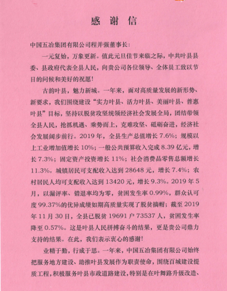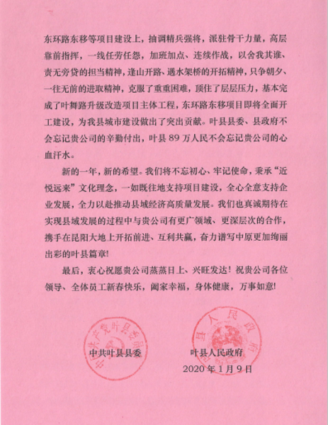 近日,建筑公司叶县项目部收到河南省叶县委、县政府的感谢信。