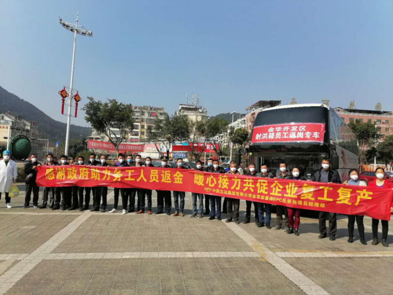 金华安置房项目是华东公司第一个全面复工复产的项目。2月19日,金华安置房项目金西地块就已正式复工,寺南与金桂苑地块于2月21日正式复工。受疫情影响,现场劳动力短缺,为尽快解决现场劳动力不足的问题,近日,金华安置房项目部在金华市经济技术开发区政府的统一组织下,派出两辆大巴前往四川省通江县及射洪市,为返工工人提供包车接送服务。
