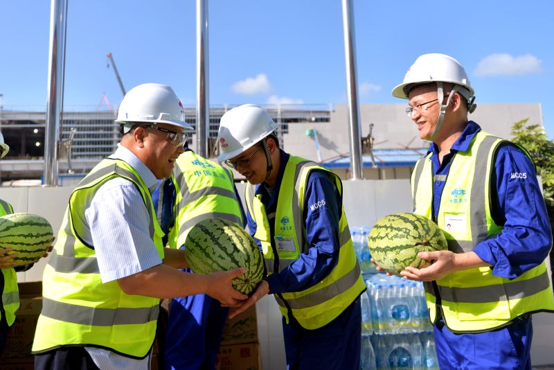 顶着烈日,程并强深入施工现场,详细了解了项目施工进度、前期材料采购、技术工艺等情况,并对项目后续收尾工作进行了指导。程并强一行向项目部全体员工送上了西瓜等解暑用品,叮嘱他们要做好防暑降温工作,注意自身的健康与安全。