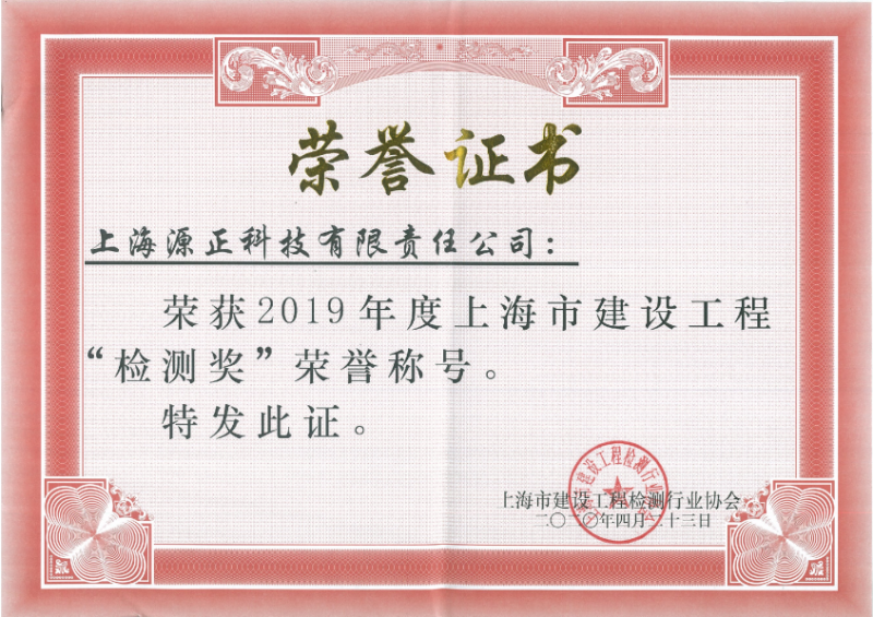 近日,从上海市建设工程检测行业协会再次传来喜讯:上海源正科技有限责任公司荣获2019年度上海市建设工程“检测奖”,这也是源正公司连续第四年摘得此项大奖!同时公司员工李武和谢德蓉两位同志还获得了“检测先进工作者”荣誉称号。众所周知,建设工程“检测奖”是上海市建设检测领域的最高奖,此番源正公司再次获奖,将激励我们在建设工程检测工作中继续做到踏实肯干、规范运作,不断努力追求进步,为工程建设提供更加科学可靠的数据和更加周到细致的服务,更好地支撑公司主业发展。(牛静/图文)