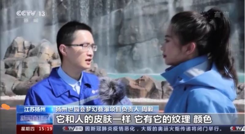 中国五冶扬州世园会梦幻叠瀑项目负责人周毅向央视记者介绍到,假山“山体”和人的皮肤一样都有着纹理、颜色,五冶人请来专业的雕刻师和着色师进行雕刻和上色,一步一步来形成了成品的惊艳效果。